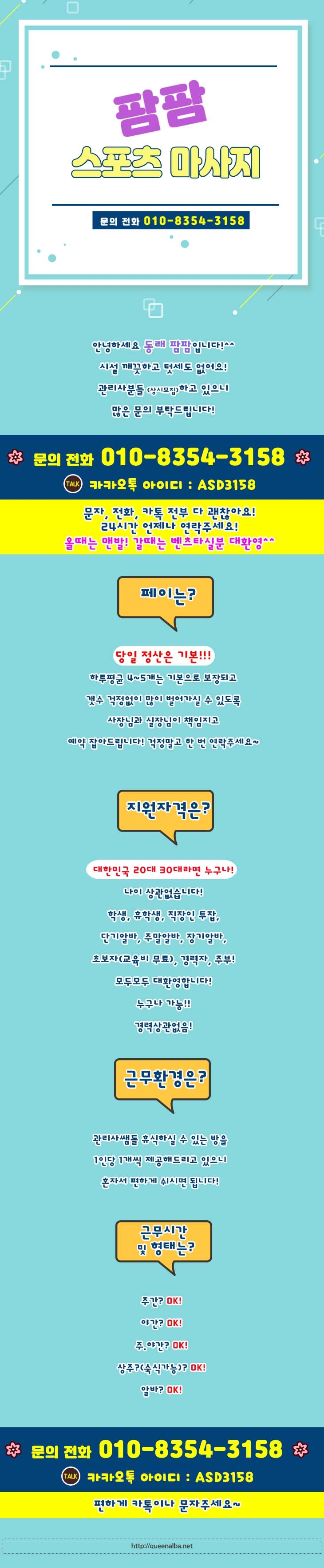 본 정보는 팜팜 스포츠 마사지님이 작성한 자료이며, 팜팜 스포츠 마사지님이 직접 등록한 이미지의 저작권 및 팜팜 스포츠 마사지님이 게재한 자료에 대한 오류 및 지연, 그 내용을 신뢰하여 취해진 조치에 대해 책임을 지지 않습니다. 본 정보는 엄지알바 동의 없이 재배포 할 수 없습니다.