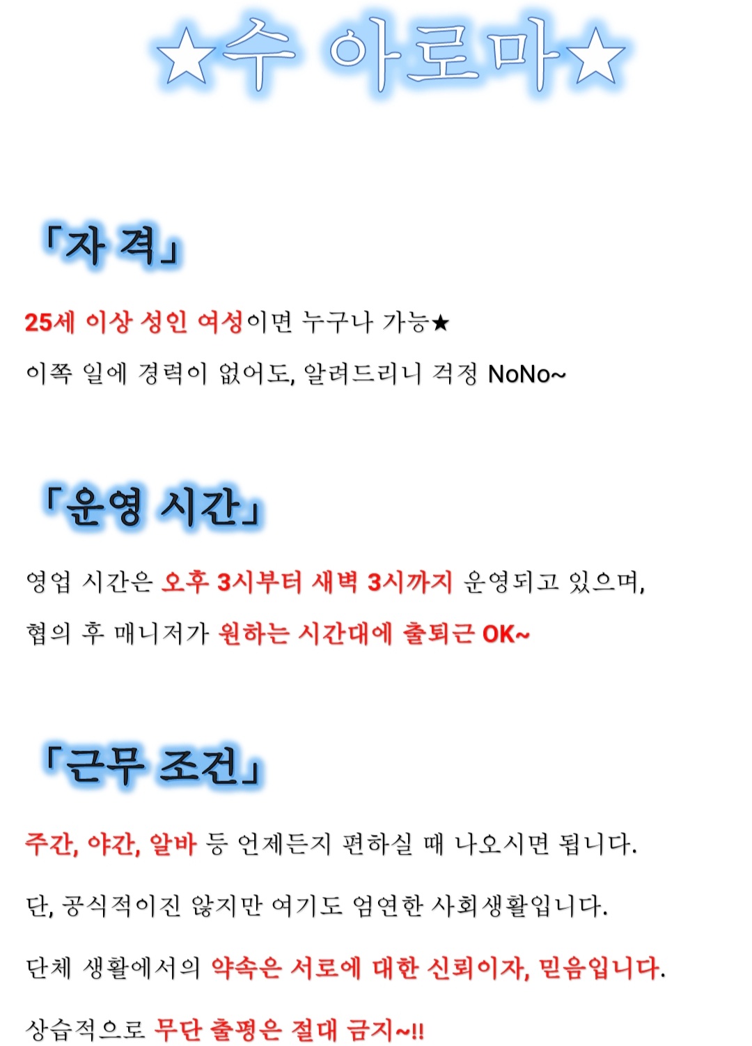 본 정보는 수실장님님이 작성한 자료이며, 수실장님님이 직접 등록한 이미지의 저작권 및 수실장님님이 게재한 자료에 대한 오류 및 지연, 그 내용을 신뢰하여 취해진 조치에 대해 책임을 지지 않습니다. 본 정보는 엄지알바 동의 없이 재배포 할 수 없습니다.