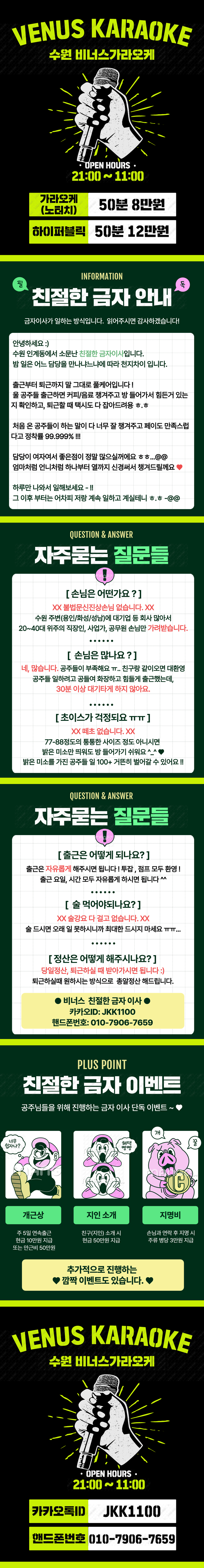 본 정보는 수원퀸방실이님이 작성한 자료이며, 수원퀸방실이님이 직접 등록한 이미지의 저작권 및 수원퀸방실이님이 게재한 자료에 대한 오류 및 지연, 그 내용을 신뢰하여 취해진 조치에 대해 책임을 지지 않습니다. 본 정보는 엄지알바 동의 없이 재배포 할 수 없습니다.